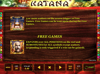 Слот-машина Katana раскроет игрокам секреты выигрышей. Как и все восточное – они просты и незамудренны. В их основу легли опции специальных символов – Вайлда и Скаттера. Вайлдом стал величественный самурай, Скаттером – катана. Дикий заменит любые рисунки, кроме катаны, что поможет чаще собирать три и больше одинаковых цепочек в ряду. Разброс активирует серию из десяти фриспинов.